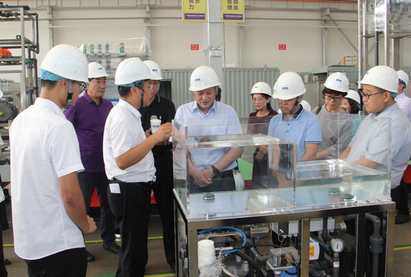 張建東局長一行先后參觀了公司展廳、全自動化生產線和設備裝配車間,詳細了解公司產業布局、核心產品、技術優勢、設備制造、項目案例等情況,并重點詢問了公司在海水淡化和海水資源化領域取得的新成果,姜總做了詳細匯報。姜總表示,金正人的思路是海水淡化和海水資源化相結合,在得到高品質淡水的同時,把海水里寶貴的礦物資源提取出來,既實現海水資源化,又避免了濃鹽水對海洋生物的污染。相比現有傳統的雙膜法海水淡化技術,金正的海淡技術具有工藝路線更短,運行成本更低,回收率更高,加藥量更少,污染更小的特點。據測算,金正環保海淡工藝低于3-4元/噸,比傳統工藝降低20-30%;產水率較傳統工藝提高10-20%,水質滿足工業用水或飲用水要求。