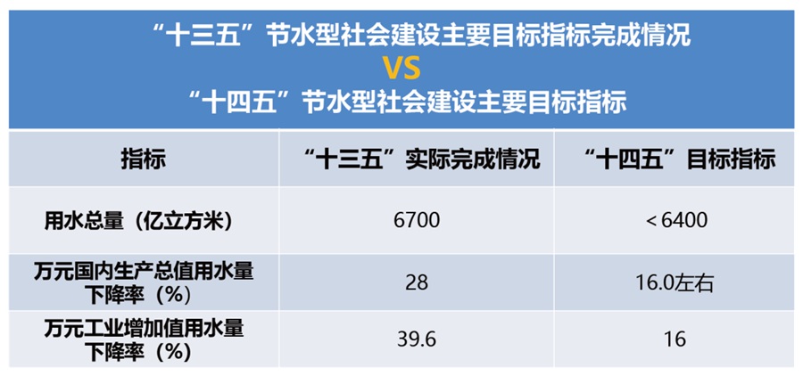 節(jié)水型社會從2000年開始探索建立至今已經(jīng)20年,取得了顯著成效。從“十三五”實(shí)際完成情況和“十四五”目標(biāo)指標(biāo)對比表顯示,2025年用水總量目標(biāo)指標(biāo)比2020年實(shí)際完成情況減少300億立方米。其中,國內(nèi)生產(chǎn)總值用水量下降率減少12%,工業(yè)增加值用水量下降率減少23.6%,我國用水結(jié)構(gòu)不斷優(yōu)化,用水效率進(jìn)一步提升。