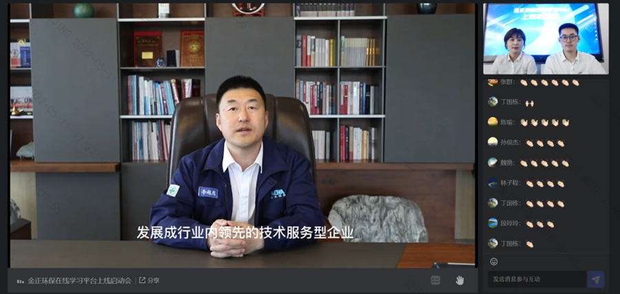 為持續(xù)做好疫情防控工作,避免人員聚集,“金正環(huán)保在線學(xué)習(xí)平臺(tái)”啟動(dòng)會(huì)以線上直播形式進(jìn)行,煙臺(tái)金正環(huán)保總經(jīng)理李越彪線上致辭。
