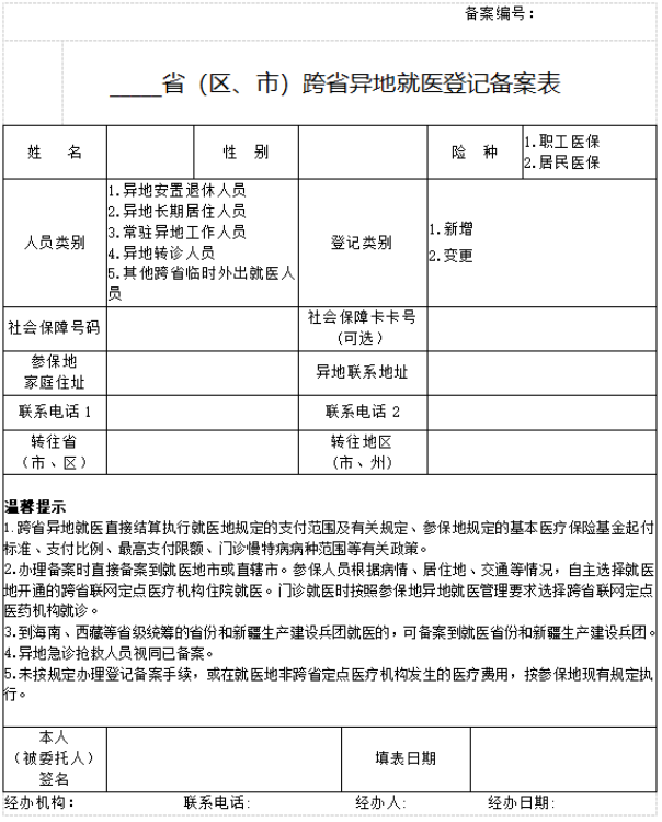 2.《____省(區、市)跨省異地就醫登記備案表》(以下簡稱備案表,備案表由醫保經辦機構提供,參保人填寫);