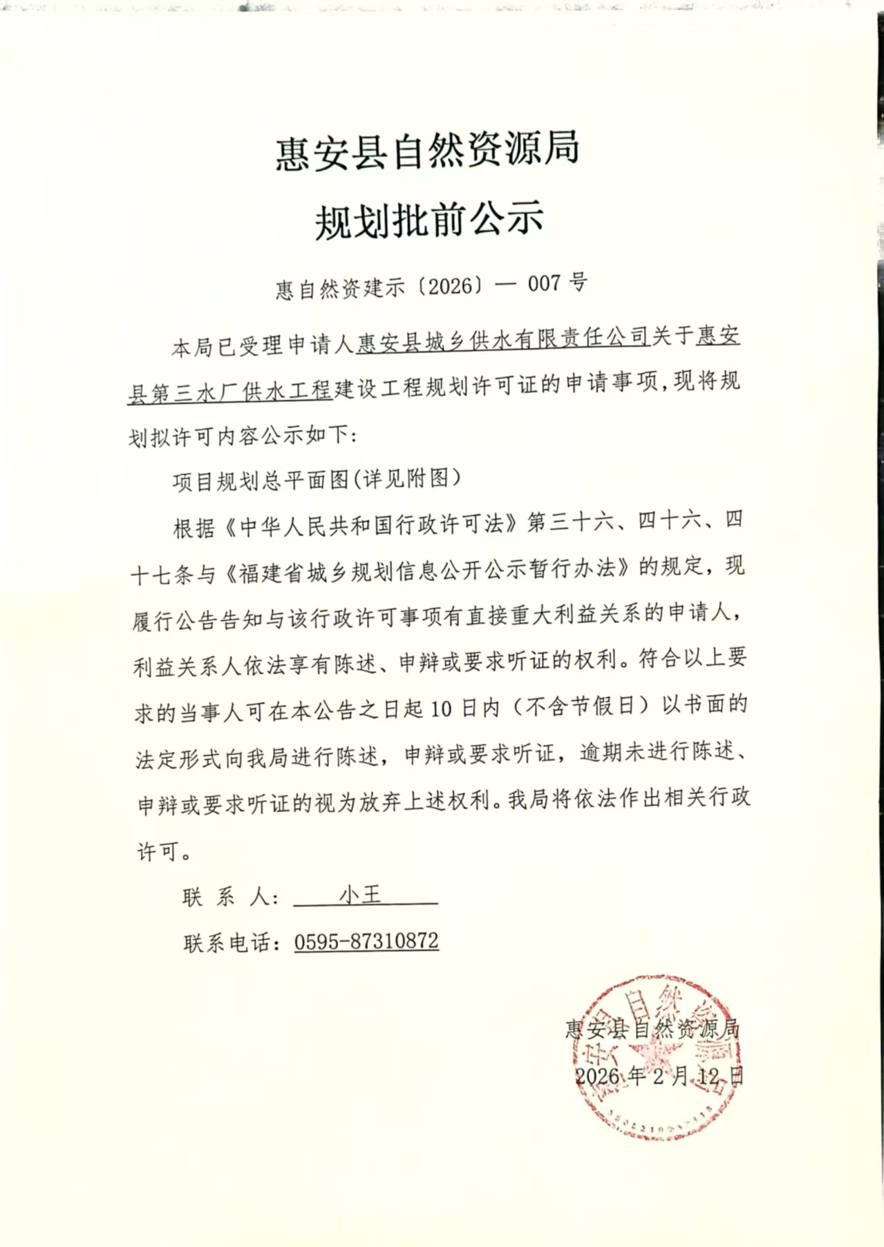 惠安縣第三水廠供水工程建設(shè)工程規(guī)劃許可批前公示