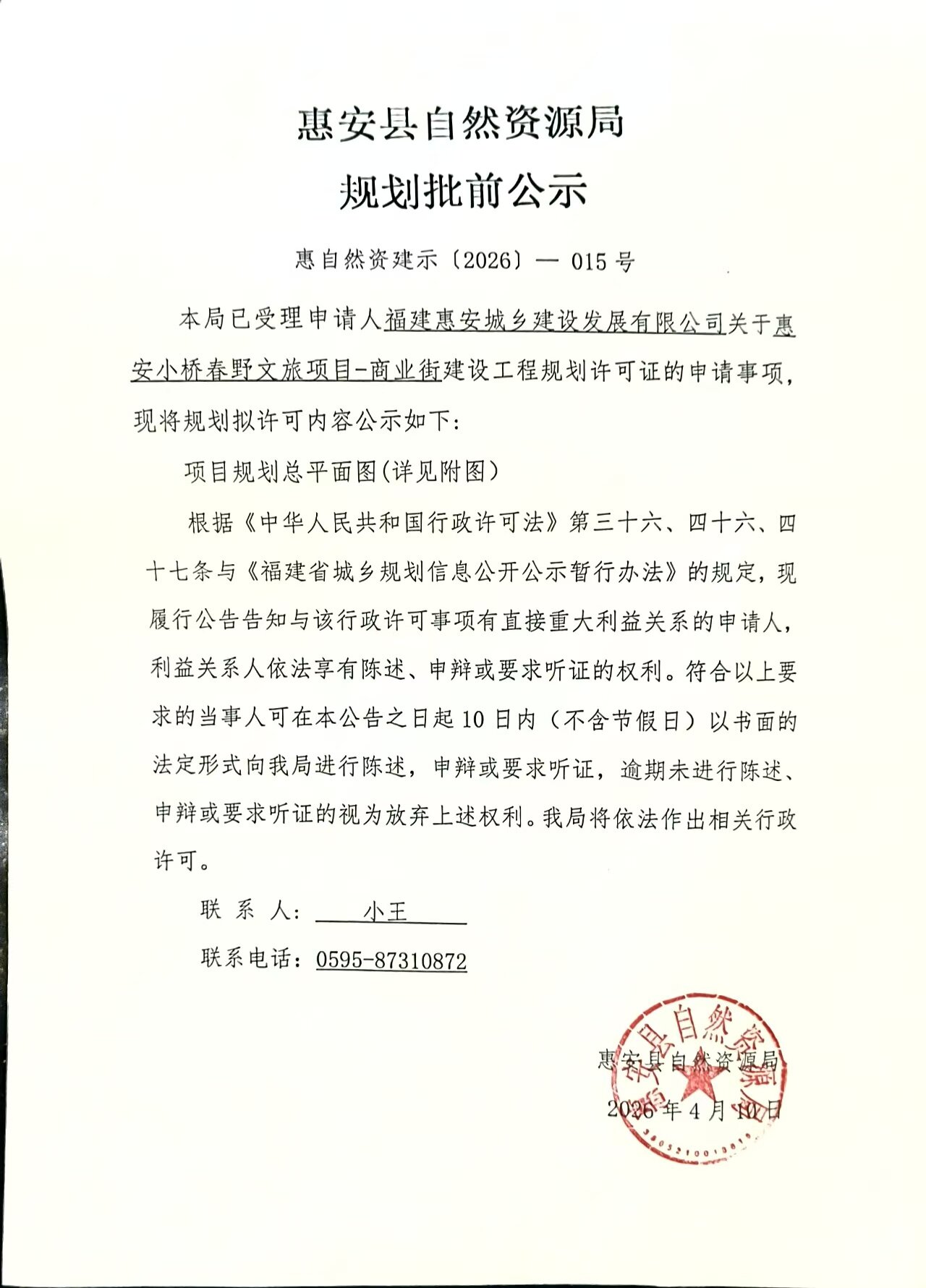 惠安小橋春野文旅項目—商業街建設工程規劃許可證批前公示