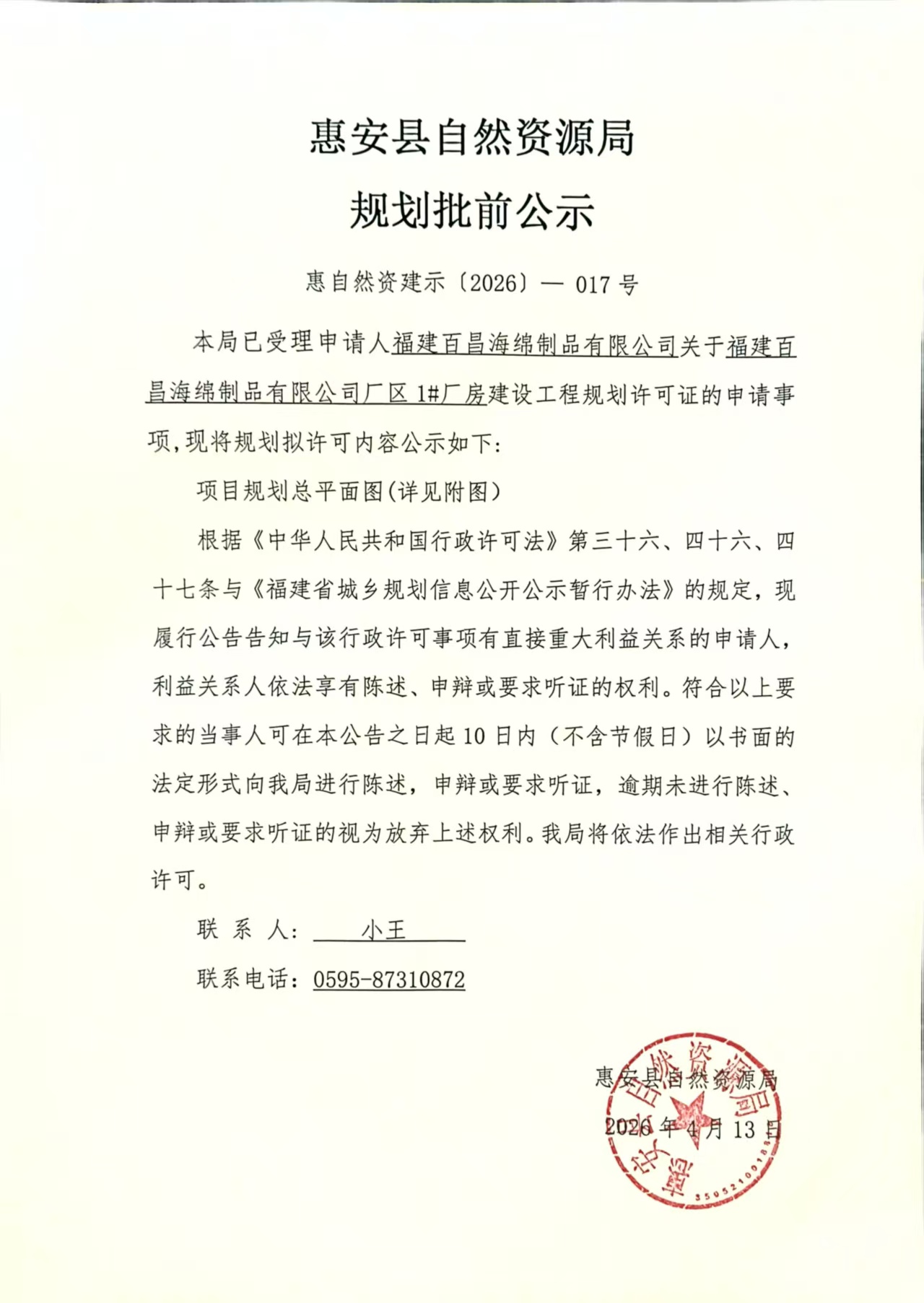 福建百昌海綿制品有限公司廠區1#廠房建設工程規劃許可證批前公示